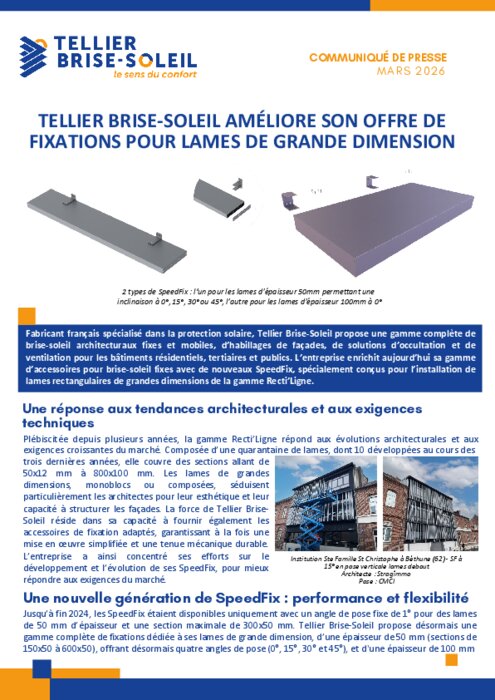 Fabricant français spécialisé dans la protection solaire, Tellier Brise-Soleil propose une gamme complète de brise-soleil architecturaux fixes et mobiles, d’habillages de façades, de solutions d’occultation et de ventilation pour les bâtiments résidentiels, tertiaires et publics. L’entreprise enrichit aujourd’hui sa gamme d’accessoires pour brise-soleil fixes avec de nouveaux SpeedFix, spécialement conçus pour l’installation de lames rectangulaires de grandes dimensions de la gamme Recti’Ligne.