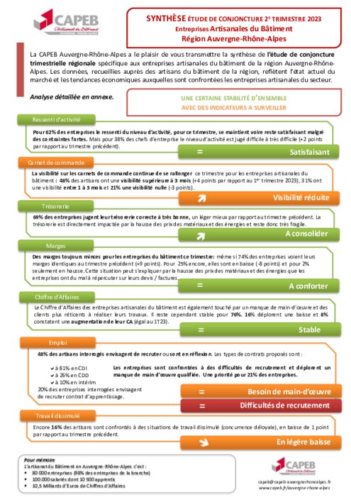 Les résultats de l’étude conduite par les CAPEB d’Auvergne-Rhône-Alpes auprès de leurs adhérents pour le 2e trimestre 2023 montrent que le marché des entreprises artisanales du bâtiment résiste et réussit à maintenir son niveau d’activité. Des résultats cependant fragiles qui nécessitent un vrai élan collectif pour relancer durablement l’activité des entreprises et relever le défi de la rénovation énergétique et de la décarbonation des bâtiments en France.