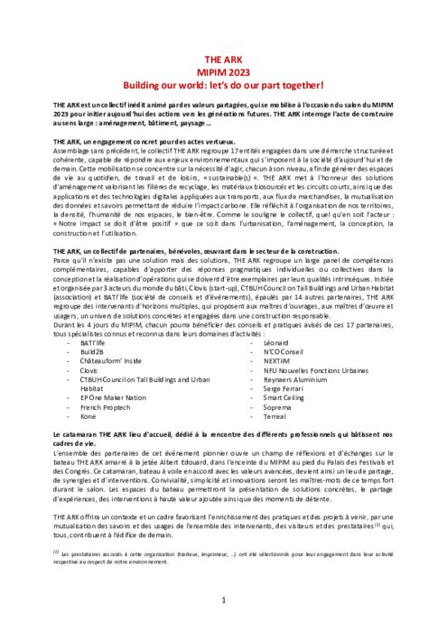 The Ark est un collectif inédit animé par des valeurs partagées, qui se mobilise à l’occasion du salon Mipim 2023 pour initier aujourd’hui des actions vers les générations futures. The Ark interroge l’acte de construire au sens large : aménagement, bâtiment, paysage…