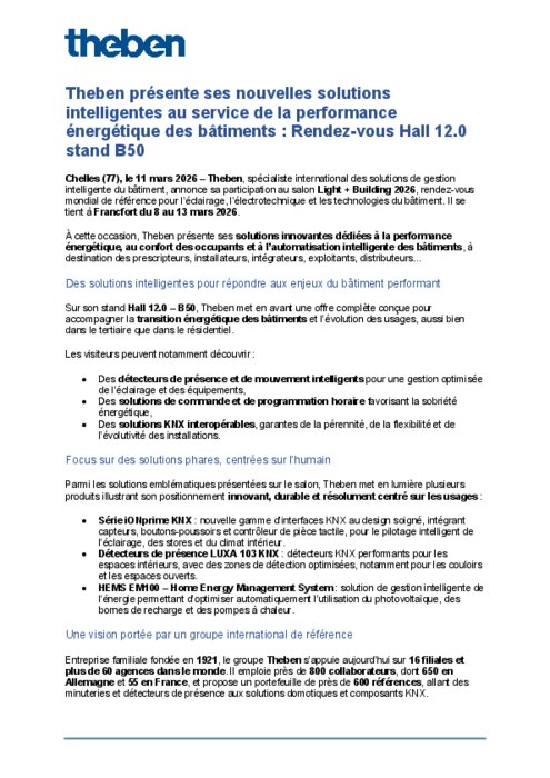 À cette occasion, Theben présente ses solutions innovantes dédiées à la performance énergétique, au confort des occupants et à l’automatisation intelligente des bâtiments, à destination des prescripteurs, installateurs, intégrateurs, exploitants, distributeurs…