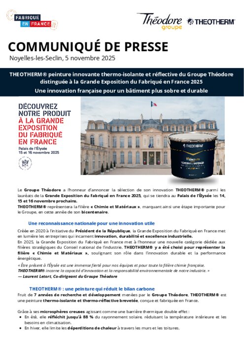 Le Groupe Théodore a l’honneur d’annoncer la sélection de son innovation THEOTHERM parmi les lauréats de la Grande Exposition du Fabriqué en France 2025, qui se tiendra au Palais de l’Élysée les 14, 15 et 16 novembre prochains. THEOTHERM représentera la filière « Chimie et Matériaux », marquant ainsi une étape importante pour le Groupe, en cette année de son bicentenaire.