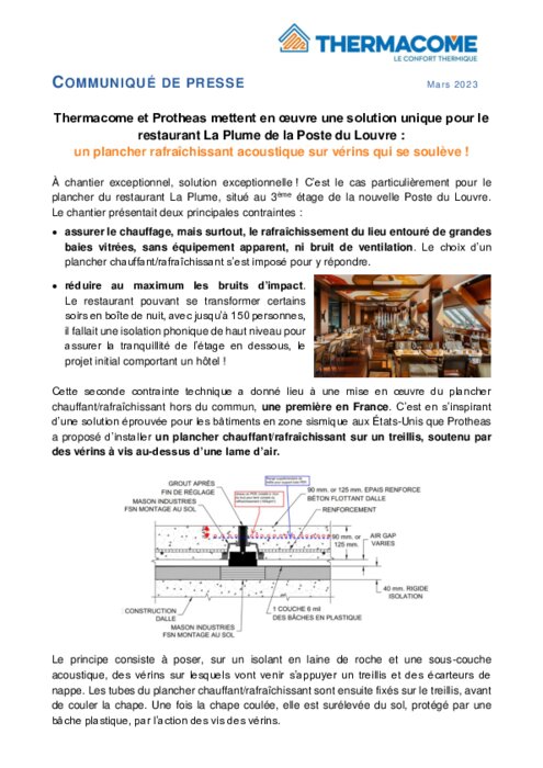 Industriels 02 mars 2023 - 13:06 C’est en s’inspirant d’une solution éprouvée pour les bâtiments en zone sismique aux États-Unis que Protheas a proposé d’installer un plancher chauffant/rafraîchissant sur un treillis, soutenu par des vérins à vis au-dessus d’une lame d’air. PDF (659 Ko) Télécharger