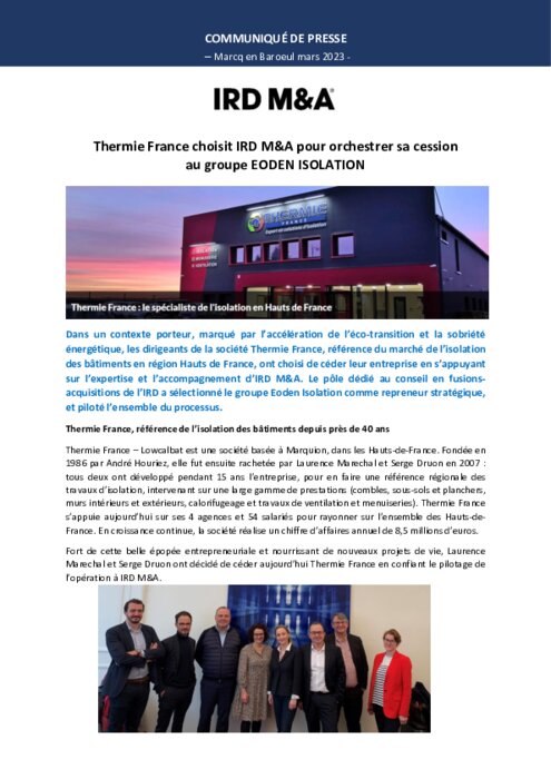 Les dirigeants de la société Thermie France, référence du marché de l’isolation des bâtiments en région Hauts de France, ont choisi de céder leur entreprise en s’appuyant sur l’expertise et l’accompagnement d’IRD M&A. Le pôle dédié au conseil en fusions-acquisitions de l’IRD a sélectionné le groupe Eoden Isolation comme repreneur stratégique, et piloté l’ensemble du processus.