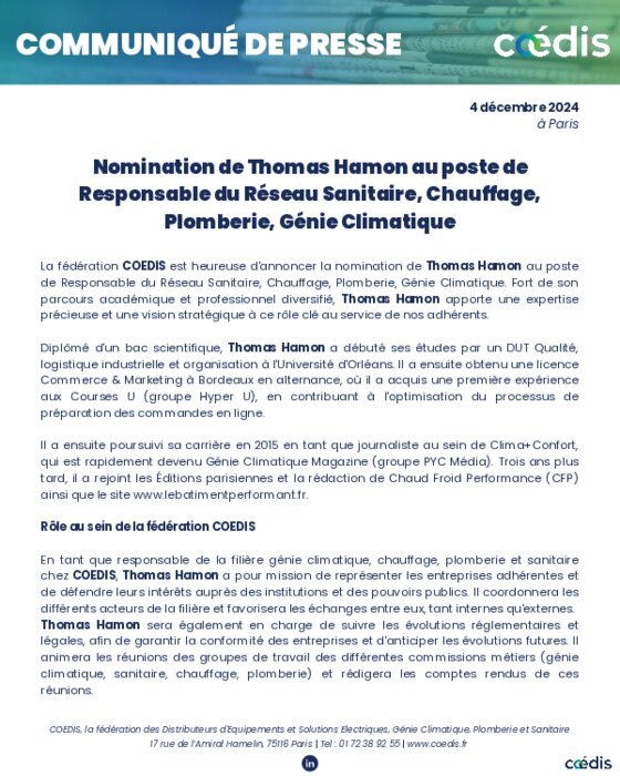 La fédération Coedis est heureuse d'annoncer la nomination de Thomas Hamon au poste de Responsable du Réseau Sanitaire, Chauffage, Plomberie, Génie Climatique. Fort de son parcours académique et professionnel diversifié, Thomas Hamon apporte une expertise précieuse et une vision stratégique à ce rôle clé au service de nos adhérents.