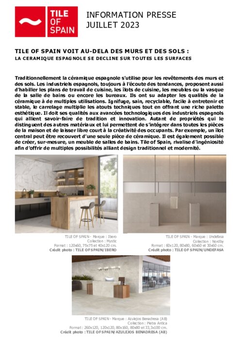 Traditionnellement la céramique espagnole s’utilise pour les revêtements des murs et des sols. Les industriels espagnols, toujours à l’écoute des tendances, proposent aussi d’habiller les plans de travail de cuisine, les îlots de cuisine, les meubles ou la vasque de la salle de bains ou encore les bureaux.