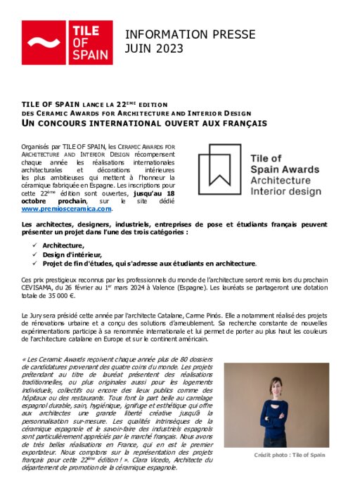 les plus ambitieuses qui mettent à l’honneur la céramique fabriquée en Espagne. Les inscriptions pour cette 22ème édition sont ouvertes, jusqu’au 18 octobre prochain, sur le site dédié www.premiosceramica.com.