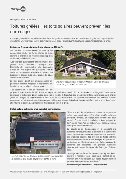 "Les énergies qui agissent lors de l'impact d'un grêlon sont énormes", explique Kay Blechschmidt, responsable du laboratoire d'essai de P+F Expert AG, qui ajoute : "Nous simulons ces énergies à l'échelle 1:1 dans notre laboratoire d'essai avec des boules de glace créées artificiellement. Le toit solaire 'Level' du fabricant suisse de panneaux solaires Megasol a également été bombardé par de telles boules de glace.