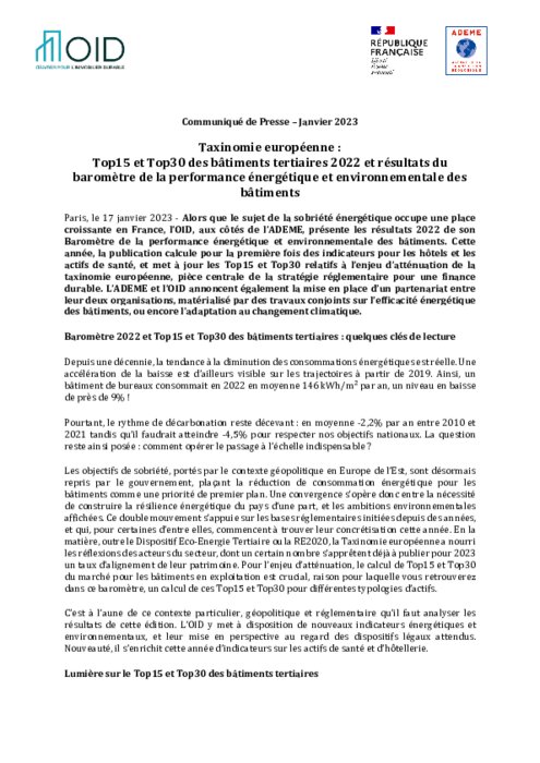 L’OID, aux côtés de l’ADEME, présente les résultats 2022 de son Baromètre de la performance énergétique et environnementale des bâtiments. Cette année, la publication calcule pour la première fois des indicateurs pour les hôtels et les actifs de santé, et met à jour les Top15 et Top30 relatifs à l’enjeu d’atténuation de la taxinomie européenne, pièce centrale de la stratégie réglementaire pour une finance durable.