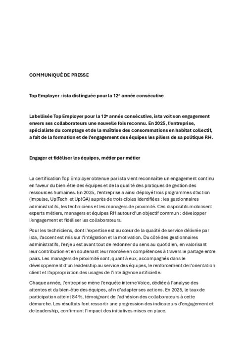 Labellisée Top Employer pour la 12ᵉ année consécutive, ista voit son engagement envers ses collaborateurs une nouvelle fois reconnu. En 2025, l’entreprise, spécialiste du comptage et de la maîtrise des consommations en habitat collectif, a fait de la formation et de l’engagement des équipes les piliers de sa politique RH.