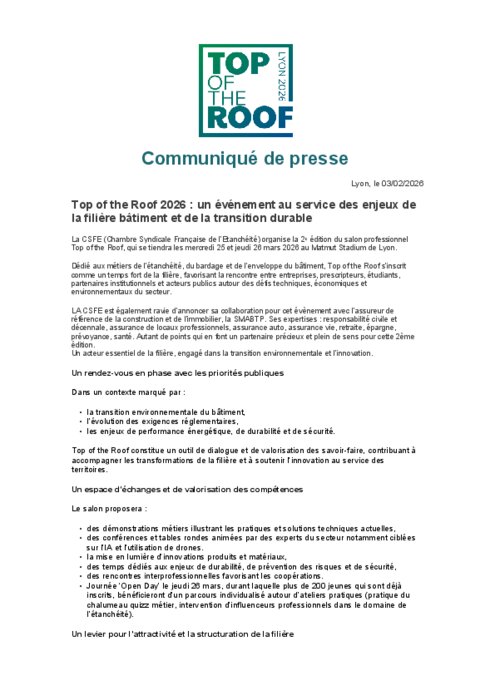 La CSFE (Chambre Syndicale Française de l’Etanchéité) organise la 2ᵉ édition du salon professionnel Top of the Roof, qui se tiendra les mercredi 25 et jeudi 26 mars 2026 au Matmut Stadium de Lyon. Dédié aux métiers de l’étanchéité, du bardage et de l’enveloppe du bâtiment, Top of the Roof s’inscrit comme un temps fort de la filière, favorisant la rencontre entre entreprises, prescripteurs, étudiants, partenaires institutionnels et acteurs publics autour des défis techniques, économiques et environnementaux du secteur.