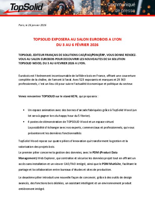 Industriels 26 janvier 2026 - 11:16 Topsolid, éditeur français de solutions CAO/FAO/PDM/ERP, vous donne rendez-vous au salon Eurobois pour découvrir les nouveautés de sa solution Topsolid Wood, du 3 au 6 février à Lyon. PDF (231 Ko) Télécharger