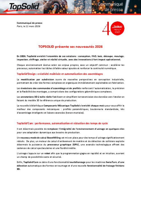 Distributeurs 11 mars 2026 - 11:43 En 2026, TopSolid enrichit l’ensemble de ses solutions : conception, FAO, bois, découpe, moulage, inspection, chiffrage, atelier et réalité virtuelle, avec des innovations à fort impact opérationnel. PDF (346 Ko) Télécharger
