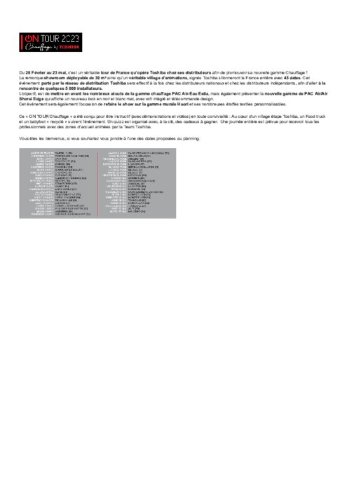 Du 28 Février au 23 mai, c’est un véritable tour de France qu’opère Toshiba chez ses distributeurs afin de promouvoir sa nouvelle gamme Chauffage. La remorque showroom déployable de 30 m² ainsi qu’un véritable village d’animations, signés Toshiba sillonneront la France entière avec 45 dates.