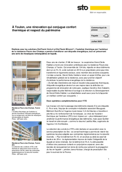 Réalisée avec les solutions StoTherm Vario 4 et StoTherm Mineral 1, l’isolation thermique par l’extérieur de la résidence Fleurs des Champs a permis d’améliorer son étiquette énergétique, tout en préservant une série de mosaïques remarquables en façade.