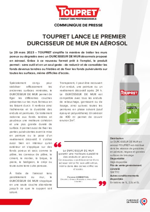 TOUPRET simplifie la manière de traiter les murs poreux ou dégradés avec un DURCISSEUR DE MUR désormais proposé en aérosol. Grâce à ce nouveau format prêt à l’emploi, le produit permet - sans outil et en un seul geste - de redurcir et de consolider les fonds devenus tendres ou friables et de fixer les fonds pulvérulents sur toutes les surfaces, même difficiles d’accès.