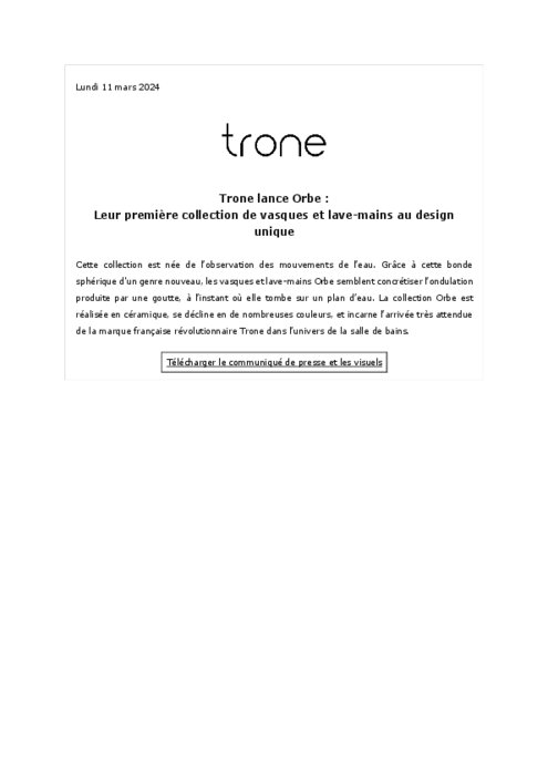 Cette collection est née de l’observation des mouvements de l’eau. Grâce à cette bonde sphérique d'un genre nouveau, les vasques et lave-mains Orbe semblent concrétiser l’ondulation produite par une goutte, à l’instant où elle tombe sur un plan d’eau. La collection Orbe est réalisée en céramique, se décline en de nombreuses couleurs, et incarne l’arrivée très attendue de la marque française révolutionnaire Trone dans l’univers de la salle de bains.