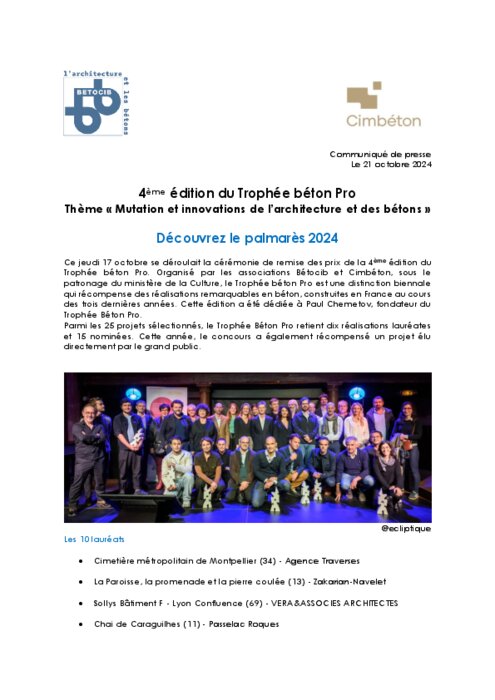 Ce jeudi 17 octobre se déroulait la cérémonie de remise des prix de la 4e édition du Trophée béton Pro. Organisé par les associations Bétocib et Cimbéton, sous le patronage du ministère de la Culture, le Trophée béton Pro est une distinction biennale qui récompense des réalisations remarquables en béton, construites en France au cours des trois dernières années.