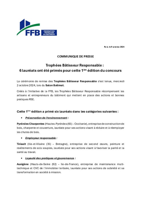 La cérémonie de remise des Trophées Bâtisseur Responsable s’est tenue, mercredi 2 octobre 2024, lors du Salon Batimat. Créés à l’initiative de la FFB, les Trophées Bâtisseur Responsable récompensent les artisans et entrepreneurs du bâtiment qui mettent en place des actions et bonnes pratiques RSE.