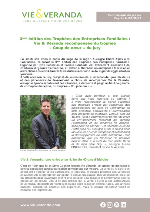 et des partenaires de l’événement, a choisi de récompenser Vie & Véranda, entreprise lyonnaise fabricant des vérandas, extensions et pergolas haut-de-gamme de conception française, du Trophée « Coup de cœur ».