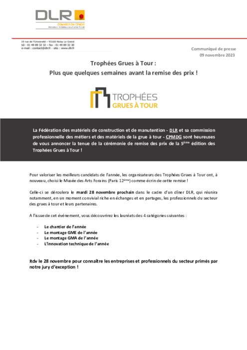 La Fédération des matériels de construction et de manutention - DLR et sa commission professionnelle des métiers et des matériels de la grue à tour - CPMDG sont heureuses de vous annoncer la tenue de la cérémonie de remise des prix de la 5ème édition des Trophées Grues à Tour.