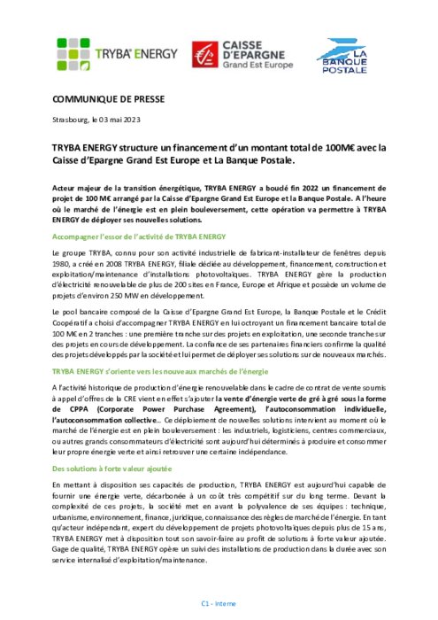 Acteur majeur de la transition énergétique, Tryba Energy a bouclé un financement de projet de 100 M€ arrangé par la Caisse d’Epargne Grand Est Europe et la Banque Postale. A l’heure où le marché de l’énergie est en plein bouleversement, cette opération va permettre à Tryba Energy de déployer ses nouvelles solutions.