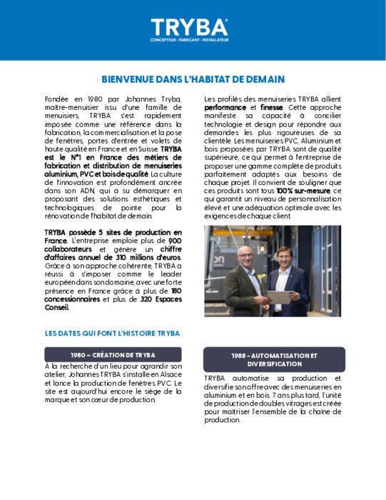 TRYBA est le N°1 en France des métiers de fabrication et distribution de menuiseries aluminium, PVC et bois de qualité. La culture de l'innovation est profondément ancrée dans son ADN, qui a su démarquer en