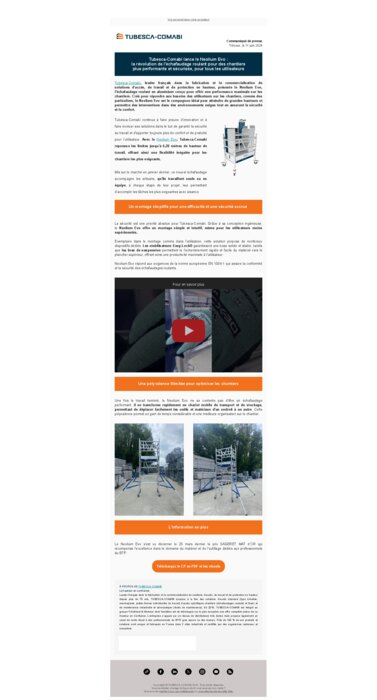 Tubesca-Comabi, leader français dans la fabrication et la commercialisation de solutions d'accès, de travail et de protection en hauteur, présente le Neolium Evo, l'échafaudage roulant en aluminium conçu pour offrir une performance maximale sur les chantiers. Créé pour répondre aux besoins des utilisateurs sur les chantiers, comme des particuliers, le Neolium Evo est le compagnon idéal pour atteindre de grandes hauteurs et permettre des interventions dans des environnements exigus tout en assurant la sécurité et le confort.