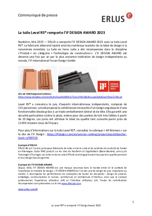 ERLUS a remporté l’iF DESIGN AWARD 2023 avec sa tuile Level RS. Le fabricant allemand rejoint ainsi les nombreux lauréats de ce label de design à la renommée mondiale. La tuile en terre cuite a été récompensée dans la discipline « Produit » en catégorie « Technologie de construction ». L’iF DESIGN AWARD est décerné une fois par an par la plus ancienne institution de design indépendante au monde, l’iF International Forum Design GmbH.