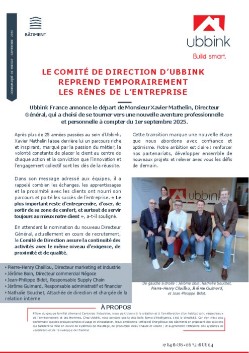 Après plus de 25 années passées au sein d’Ubbink, Xavier Mathelin laisse derrière lui un parcours riche et inspirant, marqué par la passion du métier, la volonté constante de placer le client au centre de chaque action et la conviction que l’innovation et l’engagement collectif sont les clés de la réussite.