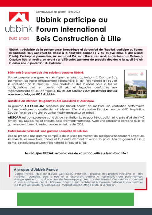 Ubbink, spécialiste de la performance énergétique et du confort de l’habitat, participe au Forum International Bois Construction, dédié à la neutralité carbone (12 au 14 avril 2023, à Lille Grand Palais). L’entreprise présentera, sur son stand I36, son offre et ses services destinés aux Maison à Ossature Bois et mettra en avant ses différentes gammes de produits dédiées à la qualité d’air intérieur et à la protection du bâtiment.