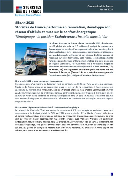 Le réseau Storistes de France réalise une année 2023 réussie avec un CA global de près de 17 millions €, malgré la conjoncture économique en tension. L’enseigne maintient son succès grâce à plusieurs facteurs forts : ses campagnes commerciales nationales, des produits made in France et son réseau d’affiliés connus et reconnus sur leurs territoires. Côté réseau, les développements notables sont : l’arrivée d’Harmonie Fenêtres (2 points de vente en région Lyonnaise), les ouvertures de 2 nouveaux magasins pour Store et Fermetures de l’Eure (Verneuil d’Avre et d’Iton, 27 ; et Rouen, 76), l’inauguration du second point de vente de MS Comtoise à Besançon (Doubs, 25), et la création du magasin de Cavalaire-sur-Mer (Var, 83) pour l’adhérent Technistores.
