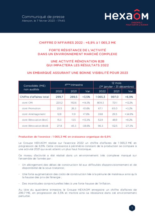Industriels 08 février 2023 - 08:47 Le Groupe HEXAOM réalise sur l’exercice 2022 un chiffre d’affaires de 1 065,3 M€ en progression de 6,9%. Cette croissance à périmètre constant de la production se compare à une activité 2021 qui avait atteint un plus haut historique. PDF (313 Ko) Télécharger