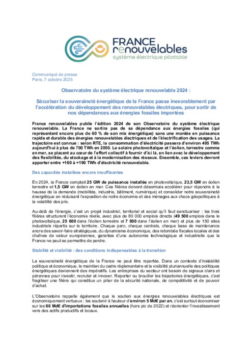 France renouvelables publie l’édition 2024 de son Observatoire du système électrique renouvelable. La France ne sortira pas de sa dépendance aux énergies fossiles (qui représentent encore plus de 60 % de son mix énergétique) sans une montée en puissance rapide et durable des énergies renouvelables électriques et de l’électrification des usages. La trajectoire est connue : selon RTE, la consommation d’électricité passera d’environ 495 TWh aujourd’hui à plus de 700 TWh en 2050. Le solaire photovoltaïque et l’éolien, terrestre comme en mer, se placent au cœur de l’effort collectif à fournir d’ici là, en lien avec le développement des flexibilités, du stockage et à la modernisation des réseaux. Ensemble, ces leviers devront apporter entre +160 à +190 TWh d’électricité renouvelable.