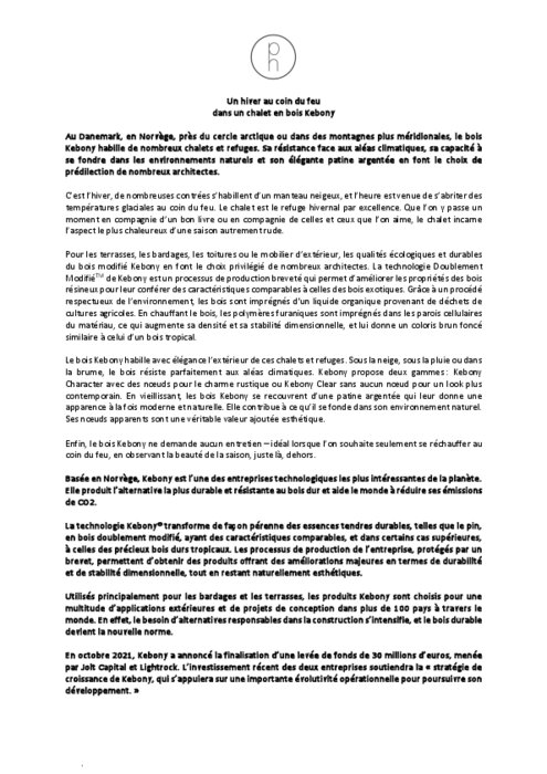 Au Danemark, en Norvège, près du cercle arctique ou dans des montagnes plus méridionales, le bois Kebony habille de nombreux chalets et refuges. Sa résistance face aux aléas climatiques, sa capacité à se fondre dans les environnements naturels et son élégante patine argentée en font le choix de prédilection de nombreux architectes.