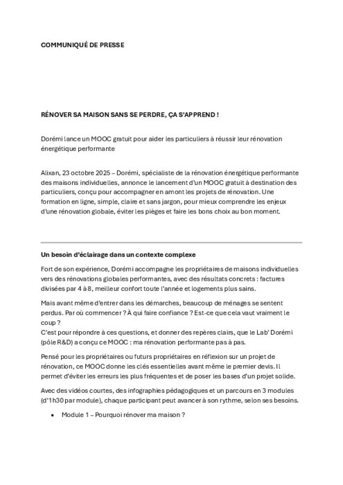 Dorémi, spécialiste de la rénovation énergétique performante des maisons individuelles, annonce le lancement d’un MOOC gratuit à destination des particuliers, conçu pour accompagner en amont les projets de rénovation. Une formation en ligne, simple, claire et sans jargon, pour mieux comprendre les enjeux d’une rénovation globale, éviter les pièges et faire les bons choix au bon moment.