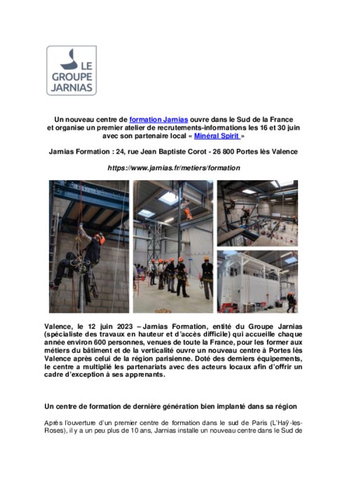 Jarnias Formation, entité du Groupe Jarnias (spécialiste des travaux en hauteur et d’accès difficile) qui accueille chaque année environ 600 personnes, venues de toute la France, pour les former aux métiers du bâtiment et de la verticalité ouvre un nouveau centre à Portes lès Valence après celui de la région parisienne. Doté des derniers équipements, le centre a multiplié les partenariats avec des acteurs locaux afin d’offrir un cadre d’exception à ses apprenants.
