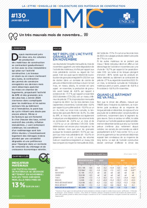 Industriels 24 janvier 2024 - 09:50 Les résultats de l’enquête mensuelle du mois de novembre suggèrent une nette dégradation de l’activité des matériaux minéraux de construction, à la fois par rapport aux mois précédents comme au regard de l’an passé. PDF (187 Ko) Télécharger