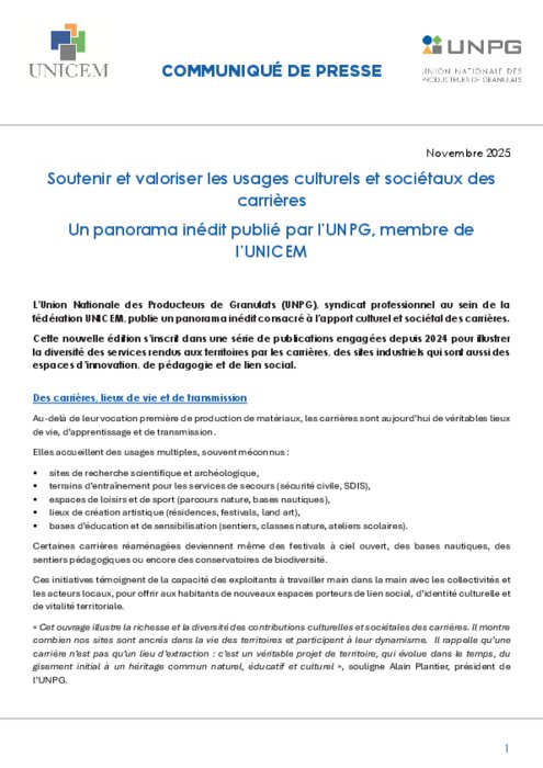L’Union Nationale des Producteurs de Granulats (UNPG), syndicat professionnel au sein de la fédération UNICEM, publie un panorama inédit consacré à l’apport culturel et sociétal des carrières. Au-delà de leur vocation première de production de matériaux, les carrières sont aujourd’hui de véritables lieux de vie, d’apprentissage et de transmission.