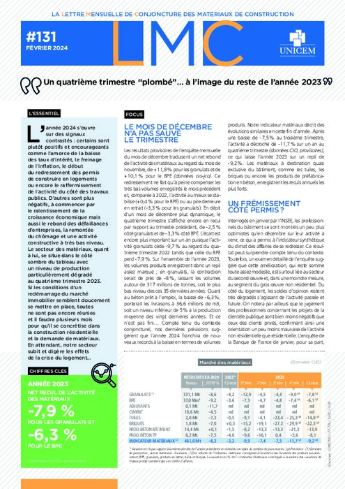 Le secteur des matériaux se situe dans le côté sombre du tableau avec un niveau de production particulièrement dégradé au quatrième trimestre 2023. Si les conditions d’un redémarrage du marché immobilier semblent doucement se mettre en place, toutes ne sont pas encore réunies et il faudra plusieurs mois pour qu’il se concrétise dans la construction résidentielle et la demande de matériaux.
