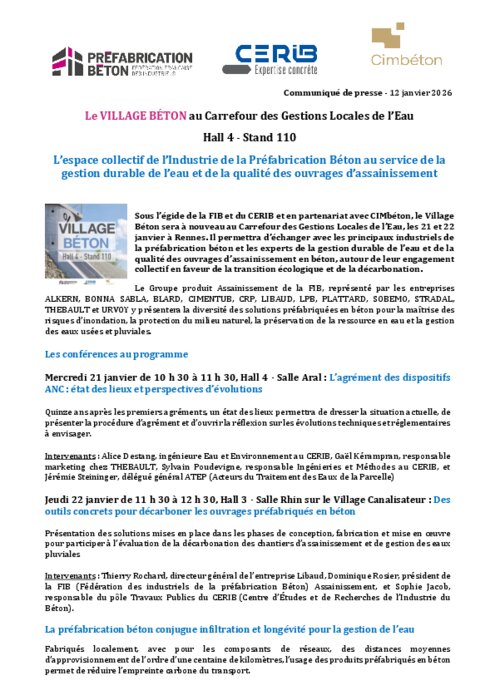 Institutionnels 12 janvier 2026 - 15:42 Douze entreprises qui présenteront leurs dernières solutions préfabriquées en béton pour pour la maîtrise des risques d’inondation, la protection du milieu naturel, la préservation de la ressource en eau et la gestion des eaux usées et pluviales. PDF (362 Ko) Télécharger credit Village Beton