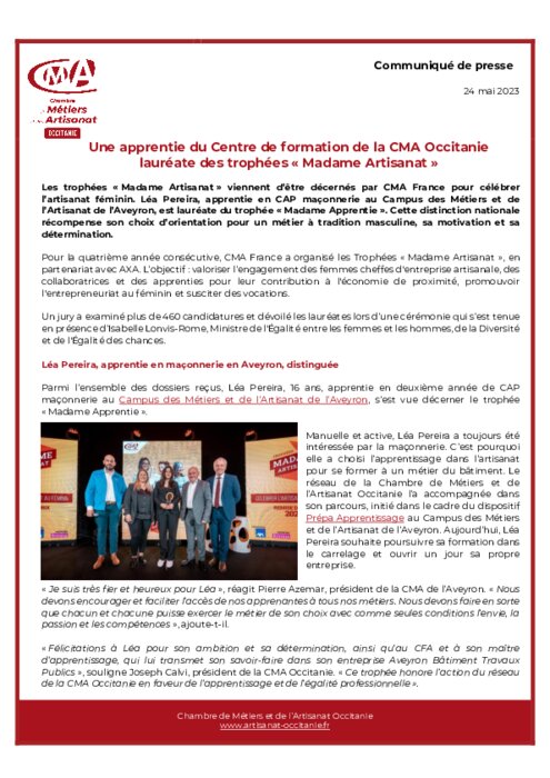 Les trophées « Madame Artisanat » viennent d’être décernés par CMA France pour célébrer l’artisanat féminin. Léa Pereira, apprentie en CAP maçonnerie au Campus des Métiers et de l’Artisanat de l’Aveyron, est lauréate du trophée « Madame Apprentie ». Cette distinction nationale récompense son choix d’orientation pour un métier à tradition masculine, sa motivation et sa détermination.