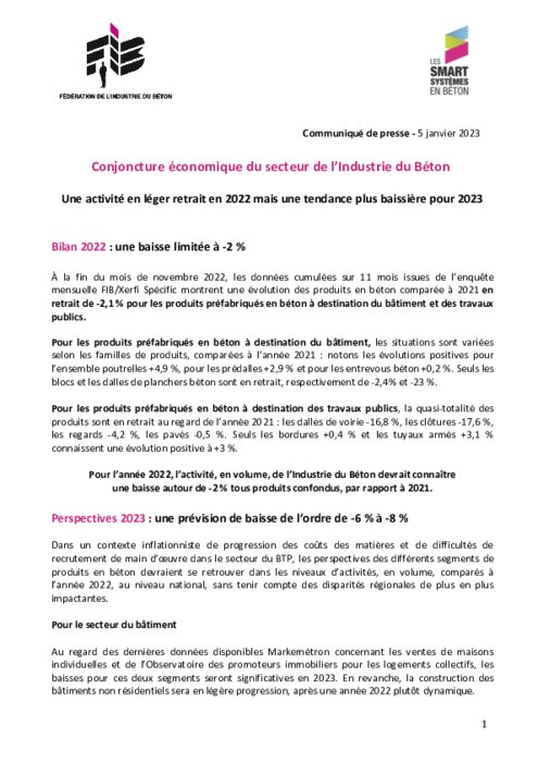 À la fin du mois de novembre 2022, les données cumulées sur 11 mois issues de l’enquête mensuelle FIB/Xerfi Spécific montrent une évolution des produits en béton comparée à 2021 en retrait de -2,1 % pour les produits préfabriqués en béton à destination du bâtiment et des travaux publics.