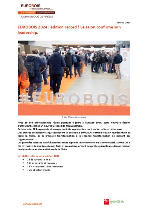 Avec 29 363 professionnels réunis pendant 4 jours à Eurexpo Lyon, cette nouvelle édition d’EUROBOIS établit un nouveau record de fréquentation. Cette année, 523 exposants et marques ont été représentés, dont un tiers d’internationaux. Des chiffres exceptionnels qui confirment la position d’EUROBOIS comme le salon représentatif de