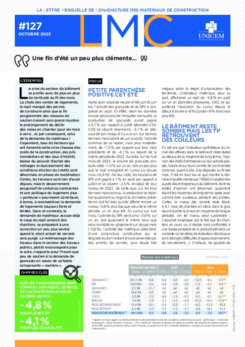 Après avoir cessé de reculer entre juin et juillet, l’activité des granulats et du BPE a progressé en août. En effet, selon les données encore provisoires de l’enquête mensuelle, la production de granulats aurait gagné +3,7% par rapport à juillet (données CVS-CJO) se situant néanmoins -3,1% en dessous de son niveau d’il y a un an.