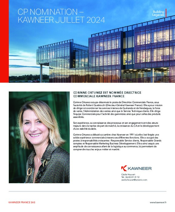 Corinne Ortunez occupe désormais le poste de Directrice Commerciale France, sous l’autorité de Robert Quattrocchi (Directeur Général Kawneer France). Elle a pour mission de diriger et coordonner les services internes de Guérande et de Vendargues, la force de vente, l’Administration des ventes ainsi que le Service Technique clients. Elle dirige l’équipe Commerciale pour l’activité des gammistes ainsi que pour celles des produits assemblés.