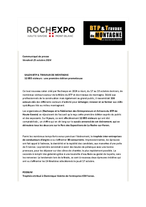Ce tout nouveau salon créé par Rochexpo en 2024 a réuni, du 17 au 19 octobre derniers, de nombreux visiteurs autour de la filière du BTP et des travaux de montagne. Dédié aux professionnels de la construction mais également au grand public, il rassemblait 116 acteurs clés des différents secteurs d'activité pour échanger, innover et se former aux défis spécifiques liés au milieu montagnard.