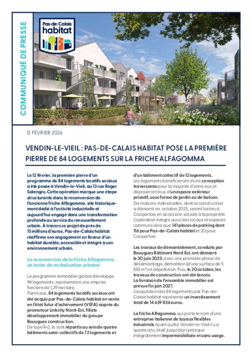 Le 12 février, la première pierre d’un programme de 84 logements locatifs sociaux a été posée à Vendin-le-Vieil, au 13 rue Roger Salengro. Cette opération marque une étape structurante dans la reconversion de l’ancienne friche Alfagomma, site historiquement dédié à l’activité industrielle et aujourd’hui engagé dans une transformation profonde au service du renouvellement urbain. À travers ce projet de près de 15 millions d’euros, Pas-de-Calais habitat réaffirme son engagement en faveur d’un habitat durable, accessible et intégré à son environnement urbain.