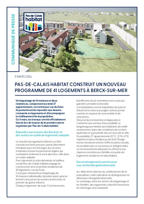 modestes et pour les personnes âgées qui souhaitent continuer à vivre dans leur ville dans un cadre adapté. Pour répondre à cette demande, le bailleur social Pas-de-Calais habitat engage la construction d’un ensemble résidentiel de 41 logements, rue du Foïer. Ce projet comprend un béguinage de 14 maisons individuelles de plain-pied, spécialement conçu pour les seniors autonomes, le premier du genre à Berck.