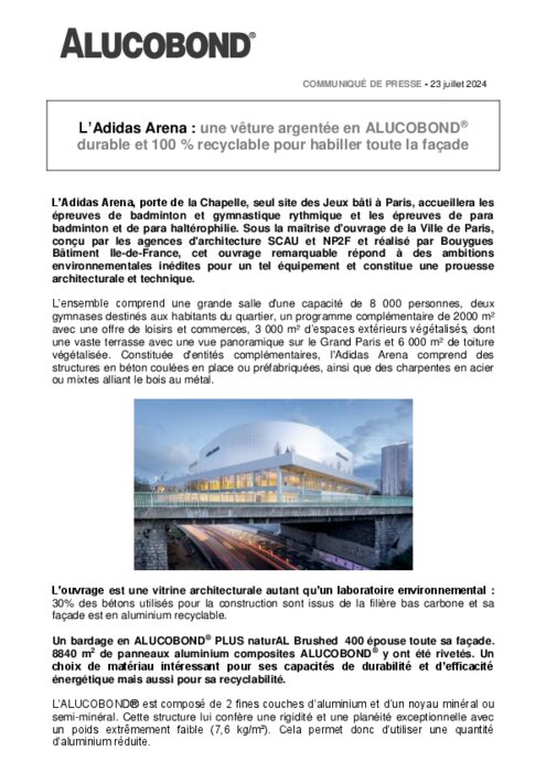 L’Adidas Arena, porte de la Chapelle, seul site des Jeux bâti à Paris, accueillera les épreuves de badminton et gymnastique rythmique et les épreuves de para badminton et de para haltérophilie. Sous la maîtrise d'ouvrage de la Ville de Paris, conçu par les agences d'architecture SCAU et NP2F et réalisé par Bouygues Bâtiment Ile-de-France, cet ouvrage remarquable répond à des ambitions environnementales inédites pour un tel équipement et constitue une prouesse architecturale et technique.