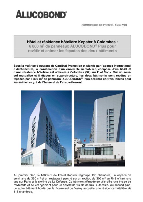 Sous la maîtrise d’ouvrage de Cardinal Promotion et signée par l’agence International d’Architecture, la construction d’un ensemble immobilier, composé d’un hôtel et d’une résidence hôtelière est achevée à Colombes (92) sur l’Îlot Cook. Sur un sous-sol mutualisé et 8 étages en superstructure, les deux bâtiments sont revêtus en façades par 6 800 m 2 de panneaux Alucobond Plus déclinés en trois teintes pour